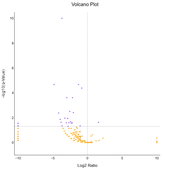 Researchers can draw insights from how expression patterns vary between two different cohorts. On Quark, the comparative distribution of gene expression between two cohorts is visualised as a volcano plot.